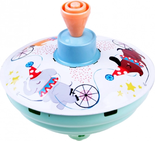 Toupie en métal traditionnelle ornée de jolis animaux, pour le plaisir des petits et des grands. Elle se met en mouvement facilement en appuyant sur le piston, tourne en douceur et émet un son léger et caractéristique qui capte l’attention des enfants. Sa conception métallique durable et ses couleurs pastel au motif de cirque en font un jouet intemporel favorisant la motricité fine et la concentration.