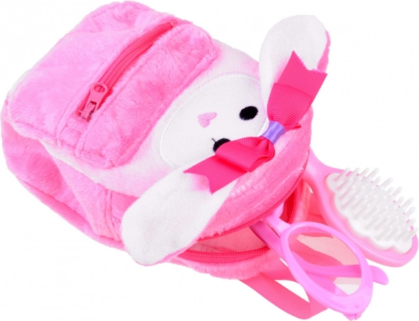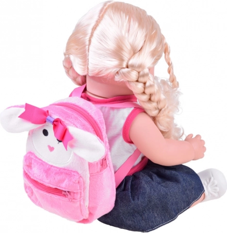 La poupée s’assoit facilement et peut tenir debout avec appui. Les lunettes roses et le sac à dos en peluche avec des oreilles de lapin stimulent l’imagination et ajoutent une touche adorable.