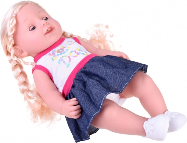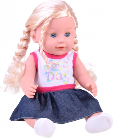 Cette charmante poupée d’environ 40 cm est fabriquée dans un matériau sûr et de haute qualité, et séduit par les détails réalistes de son visage et son doux sourire. Les longs cheveux blonds tressés invitent au brossage et au coiffage, tandis que les yeux bleus à mécanisme dormeur rendent le jeu encore plus authentique.