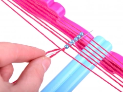 Le métier rose et bleu maintient fermement les fils en place et permet d’enfiler les perles aisément ainsi que de créer des motifs réguliers.