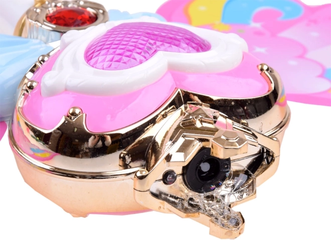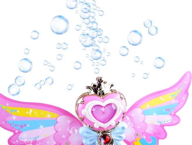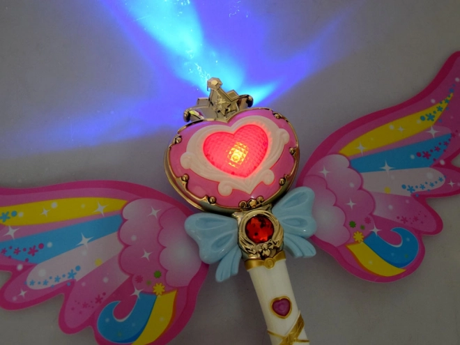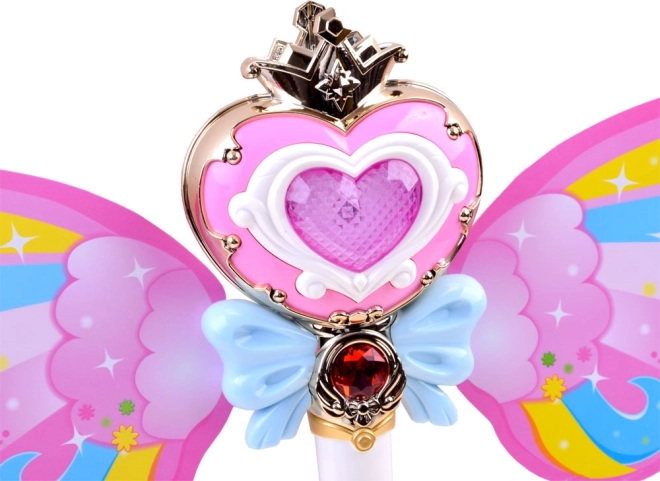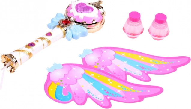 Cette baguette enchanteresse avec des ailes arc-en-ciel offre la possibilité de libérer des bulles de savon colorées, pour le plaisir de chaque enfant. Lorsqu'on appuie sur le bouton, une musique joyeuse retentit et la baguette s'illumine de lumières vives.