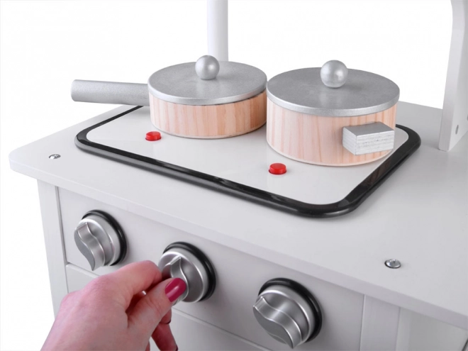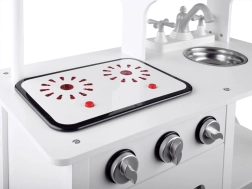 Cette élégante cuisine blanche en bois et MDF offre aux enfants une expérience de cuisine réaliste. La plaque interactive imite l’eau bouillante avec des effets lumineux et sonores, les boutons rotatifs « cliquent » agréablement et la cuvette métallique de l’évier se retire facilement pour un nettoyage pratique. Des matériaux de qualité et une finition avec peintures non toxiques garantissent un jouet sûr et durable.