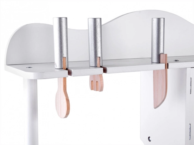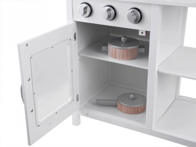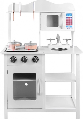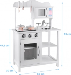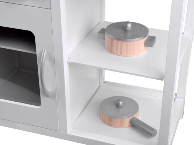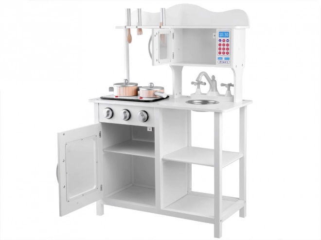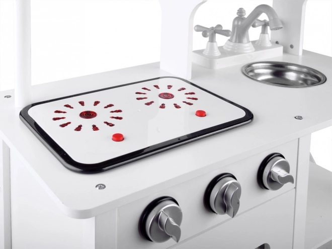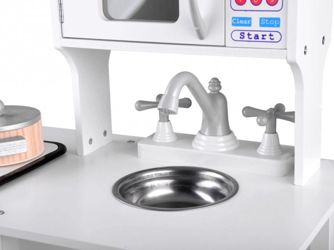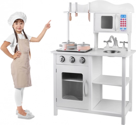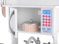 Élégante cuisine pour enfant en bois blanche pour petits chefs avec plaque à induction avec lumières et sons, évier métallique, micro-ondes et riche assortiment d’accessoires. Elle stimule la créativité, l’imagination et la motricité fine, et offre des heures de jeu autour de la cuisine.