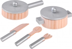- Accessoires en bois : casserole avec couvercle, poêle avec couvercle, couteau en bois, cuillère et fourchette.