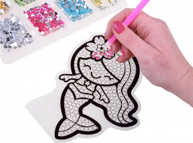 Tout le nécessaire se trouve dans la boîte – 12 autocollants, 2 grands modèles à poser ou à suspendre, env. 1000 strass colorés en 7 nuances, des ventouses avec crochets, des socles, un plateau de tri, de la cire et un applicateur. Les décorations terminées peuvent être posées sur une table, suspendues à une fenêtre ou servir à décorer cahiers et journaux.