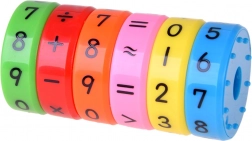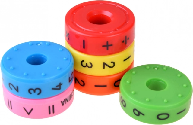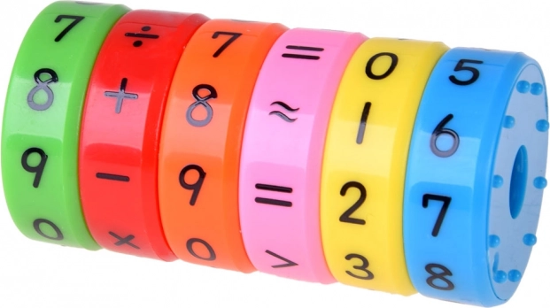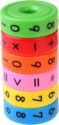 Six anneaux magnétiques colorés permettent aux enfants de créer différentes opérations mathématiques.
