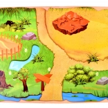 Le tapis de jeu comprend différents terrains tels que de l'herbe, un chemin et un étang, enrichissant les expériences ludiques des enfants.