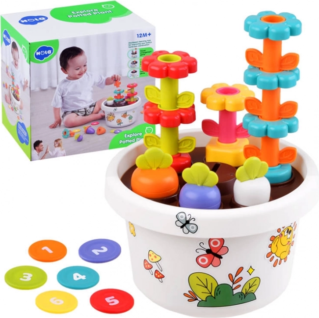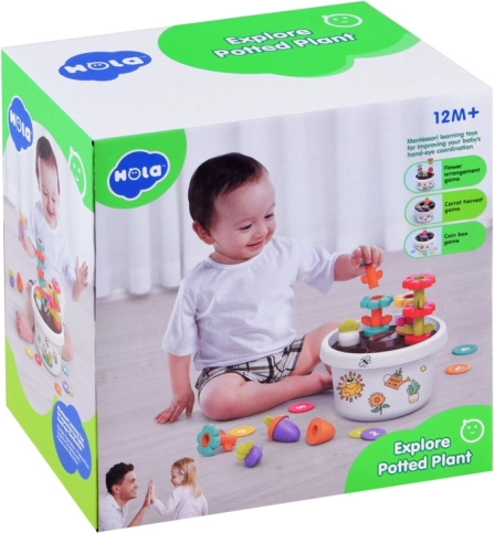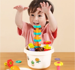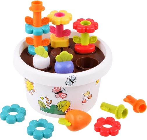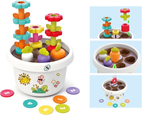 Chaque partie du jouet offre différentes options pour que les enfants puissent apprendre les couleurs et formes de base. Toutes les pièces peuvent être facilement rangées dans le pot de fleurs, économisant ainsi de l'espace et maintenant l'ordre.