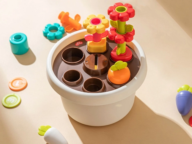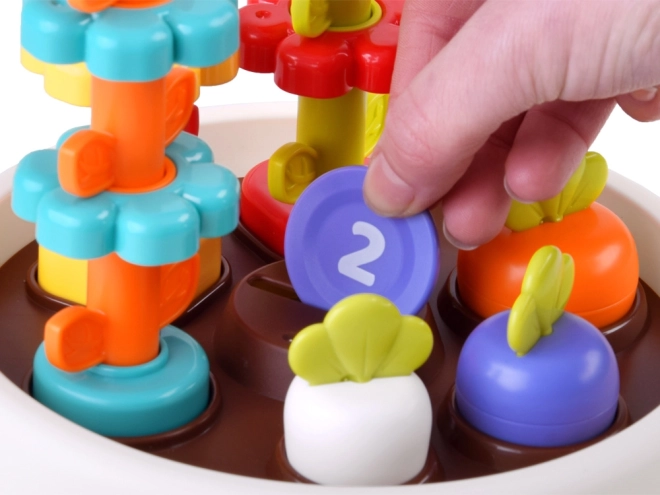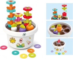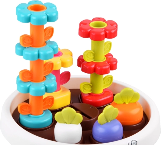 Le jouet soutient les compétences motrices fines de l'enfant grâce à des éléments interactifs tels que des fleurs empilables et des jetons colorés.