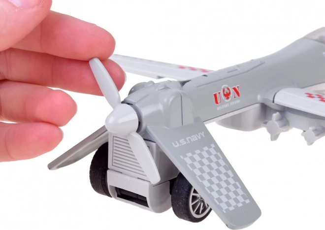 Le modèle est en métal et plastique, avec des ailes pliables et une hélice fonctionnelle, chaque détail étant soigneusement travaillé.