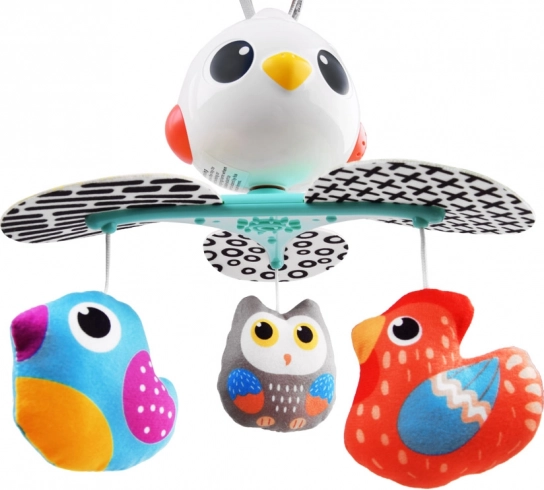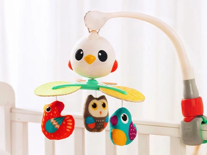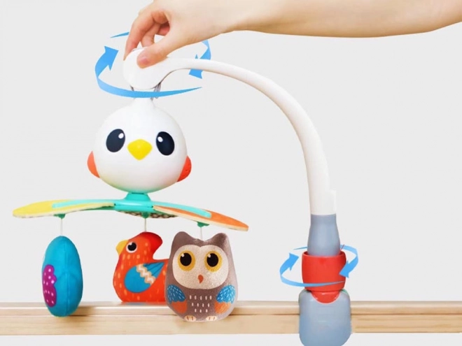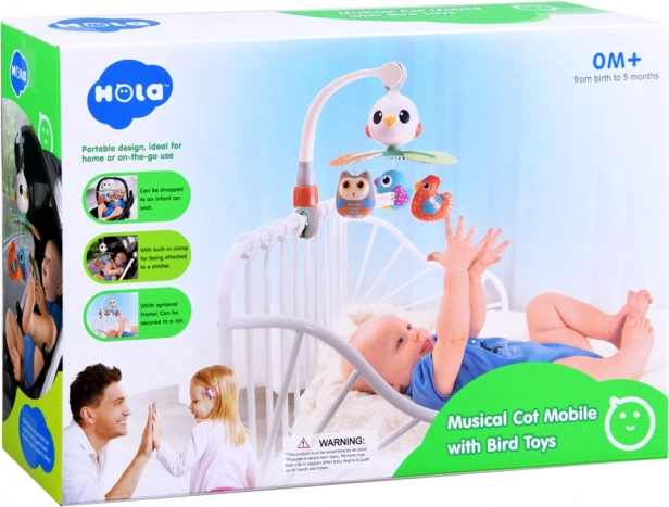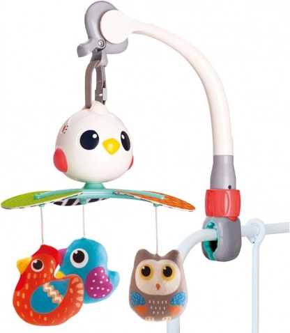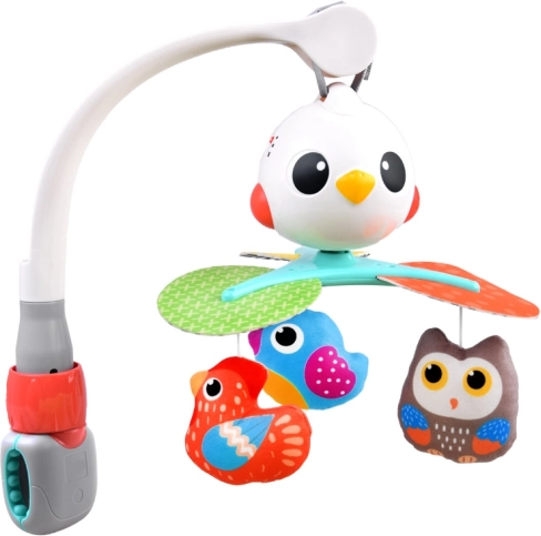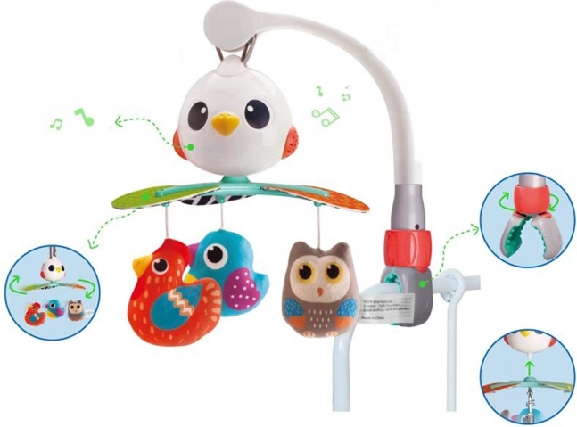 Ce magnifique mobile pour enfants est conçu pour stimuler les sens visuel, auditif et tactile de votre enfant. Des chansons éprouvées et des mélodies agréables garantissent que bébé reste satisfait et apaisé. La structure rotative est complétée par des jouets suspendus en forme d’oiseaux multicolores, invitant à la préhension et au toucher.