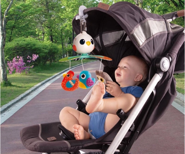 Grâce au clip universel, vous pouvez fixer le mobile facilement à différents types d’équipements pour enfants, tels que les lits ou les poussettes.