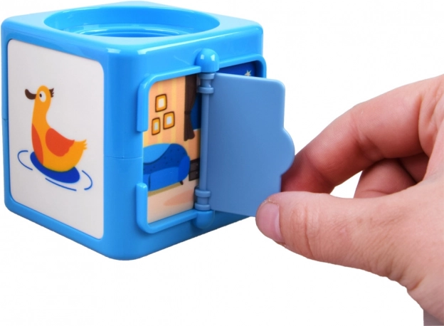 - Le bloc bleu a : une fenêtre avec volets, des étoiles dans le ciel nocturne, des canapés d'intérieur, un canard, une fraise, des trous pour les boules.