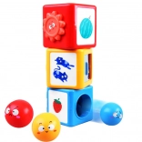 Les boules colorées peuvent être insérées dans les blocs, ce qui familiarise l'enfant avec les concepts de gravité et d'inertie.