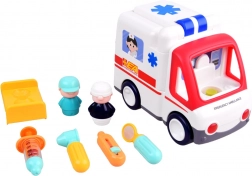 L’ambulance est équipée des outils et accessoires suivants : - thermomètre - abaisse-langue/miroir auriculaire - miroir laryngologique - seringue d’injection - brancard - figurine de patient - figurine universelle de médecin/sauveteur/conducteur