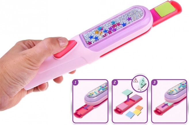 Pour que vos cheveux paraissent parfaits, commencez par les humidifier. Retirez la plaque de l'applicateur et placez-y votre sélection de craies colorées. Remettez ensuite cette plaque dans l'applicateur et glissez simplement sur vos cheveux pour des résultats immédiats. Pour un effet plus intense, répétez plusieurs fois le processus sur la même mèche.