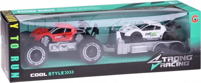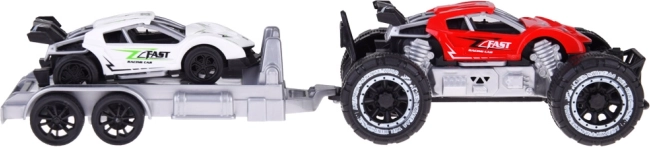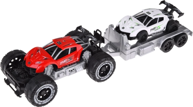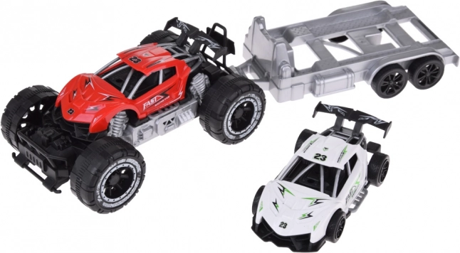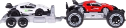 Voiture tout-terrain et petite voiture de sport avec remorque offre du plaisir pour chaque petit fan d'automobile. Les petites voitures sont fabriquées en plastique, la remorque est idéale pour transporter la voiture de sport aux courses.
