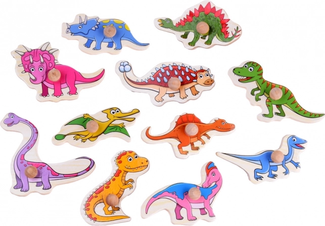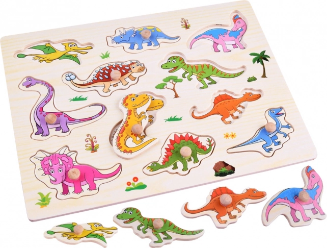 Puzzle à encastrer en bois coloré sur le thème des dinosaures, comprenant 11 pièces de dinosaures avec des boutons de préhension pratiques pour une saisie facile. Excellent jouet éducatif pour développer la motricité fine, l'association des formes et la coordination œil–main. Dimensions du plateau env. 29,5 × 22 × 1 cm.