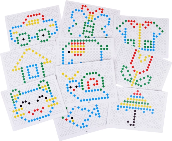Des cartes à motifs (voiture, maison, poisson, fleur, etc.) sont incluses et les enfants les reproduisent sur la grille à l’aide des chevilles colorées. L’apprentissage des formes et des motifs est amusant et intuitif.