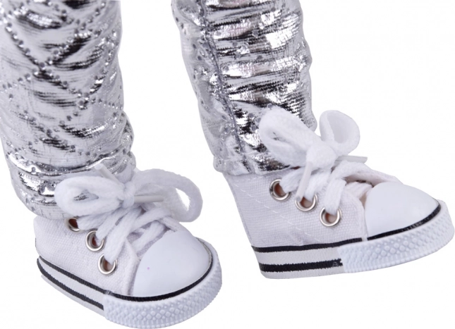 Le doux manteau rose en fourrure, les cache-oreilles et le pantalon argenté sont complétés par des baskets blanches à lacets – idéal pour des aventures hivernales imaginaires.