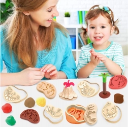 Rouleau, moules, emporte-pièces, volcan et arbre composent un environnement de jeu cohérent. Les enfants peuvent modéliser des scènes et apprendre à combiner les couleurs et les formes.