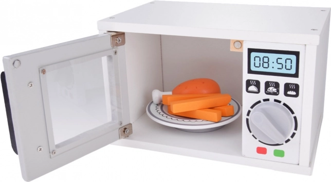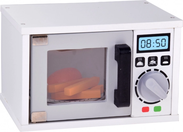 Le four à micro-ondes en bois est un complément parfait à la cuisine d'enfants. Fabriqué en bois de qualité, il possède un cadran en plastique qui émet un son crépitant lorsqu'on le tourne. Le micro-ondes a un design réaliste avec une couleur blanche et des détails gris-noir.