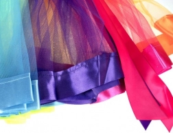 Le centre d'attention est une jupe inspirée des couleurs de l'arc-en-ciel, faite de tulle multicouche et finie avec un ruban en satin.