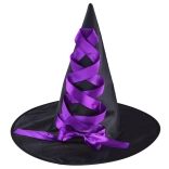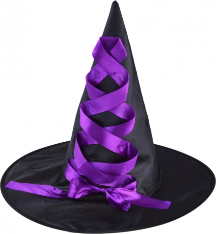 Chapeau de sorcière noir orné d’un ruban satiné violet. Sa forme rigide et le contraste marqué des couleurs soulignent un look ensorcelant.