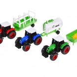 - 3 tracteurs en rouge, bleu et vert, avec différentes remorques pour des activités agricoles variées