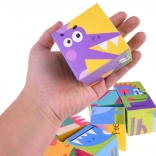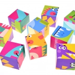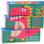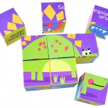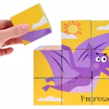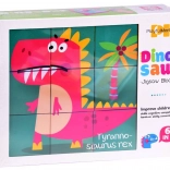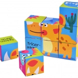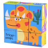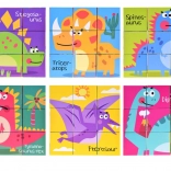 Neuf cubes permettent de composer six images différentes de dinosaures grâce à des illustrations colorées facilitant l’apprentissage.