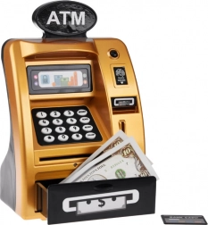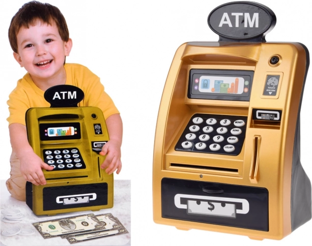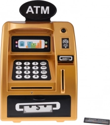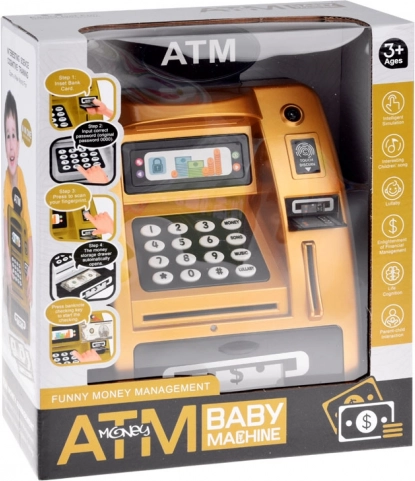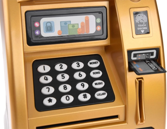 Découvrez le distributeur automatique doré, qui ressemble et fonctionne comme un vrai DAB. Il est en plastique avec un design réaliste incluant un clavier, un écran numérique et une fente pour carte. En insérant la carte jouet et en saisissant un code PIN, les enfants activent les fonctionnalités du distributeur.
