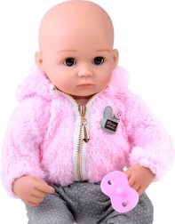 La poupée ressemble à un nouveau-né. Elle a un petit corps en tissu doux et la tête, les bras et les jambes en caoutchouc rigide. Lorsque vous allongez la poupée, ses yeux se ferment. Comme un vrai bébé, elle n’a pas de cheveux, mais elle est protégée du froid par un sweat à capuche rose chaud et agréable. La tenue est complétée par un legging gris à pois, très stylé.