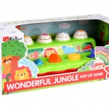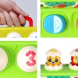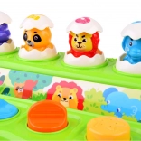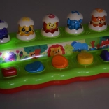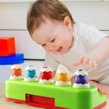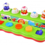 Ce jouet pop-up coloré, sur une base verte, cache cinq adorables animaux dans des « coquilles ». L’enfant fait glisser, appuie, tourne ou bascule différents éléments de commande et observe les animaux sauter joyeusement. Le jouet développe la pensée logique (cause–effet), la motricité fine des doigts et favorise la perception sensorielle.