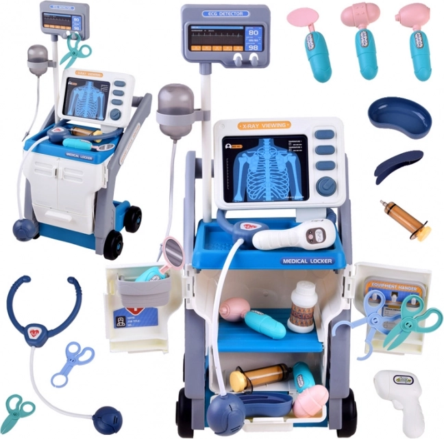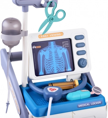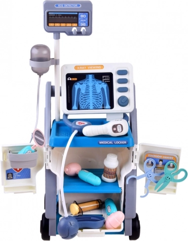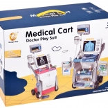 Ce chariot médical stable sur roulettes offre aux enfants tout ce dont ils ont besoin pour jouer au docteur : un moniteur avec cartes pour les « radiographies » et le test de vision, une armoire de rangement avec tiroir coulissant et de nombreux outils en plastique sûrs aux couleurs conviviales. Une fois les piles insérées, le panneau interactif émet des sons de surveillance des fonctions vitales, le thermomètre bippe et s’illumine, et le stéthoscope permet d’entendre les battements du cœur.