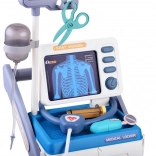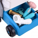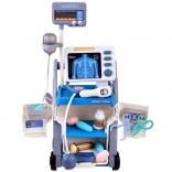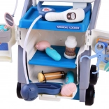 Chariot sur roulettes avec panneau et armoire fermable ; stéthoscope avec son ; perfusion ; thermomètre (lumière et son) ; otoscope ; marteau neurologique ; seringue ; miroir dentaire lumineux ; ciseaux ; pince/attrape-objet ; pince à épiler ; bassin médical ; faux flacon de médicaments ; 3 cartes de radiographie et 1 carte pour le test de vision ; autocollants.