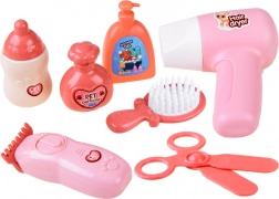 Sèche‑cheveux, brosse, peigne, ciseaux, tondeuse, flacons et autocollants transforment chaque séance de jeu en un salon de beauté canin créatif.
