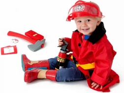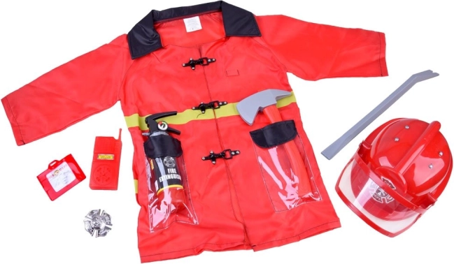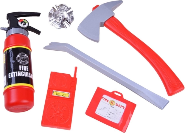 Hache, pied-de-biche, talkie-walkie, badge et carte de pompier – le petit sauveteur a tout le nécessaire pour un jeu réaliste.