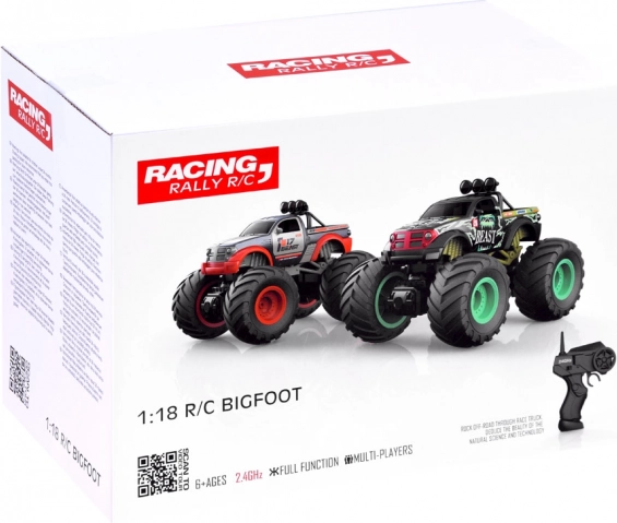 Amusant RC monster truck Big Foot à l’échelle 1:18 offrant une expérience tout-terrain puissante, de grandes roues en caoutchouc à crampons pour une traction sûre et un pilotage 2,4 GHz fiable sans interférences. La construction légère en plastique est idéale pour les enfants et les débutants, et l’emballage comprend un chargeur USB et une batterie Li‑Ion 3,7 V 500 mAh.