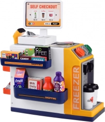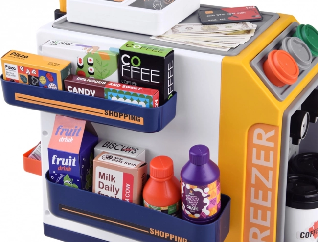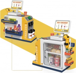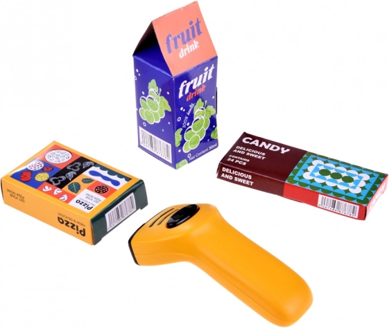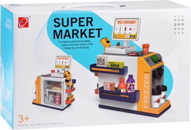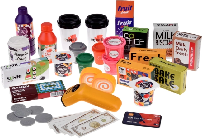 Le set comprend 46 éléments soigneusement conçus : une caisse sonore, un scanner lumineux, un lecteur de cartes, des gobelets à café et à espresso, des boissons factices, des yaourts, des glaces et des boîtes en papier (lait, biscuits, café, sushi, pizza, etc.), ainsi que des billets, pièces et une carte de crédit. Il développe ainsi la communication, la motricité fine et la littératie financière.