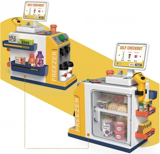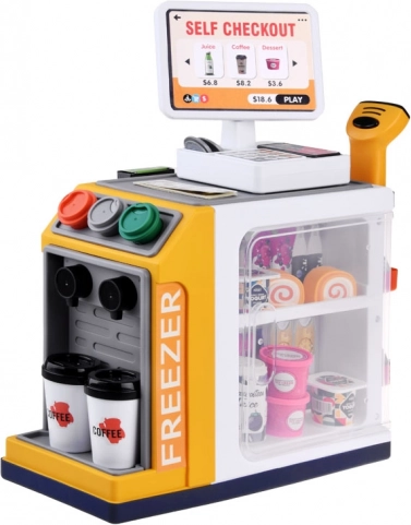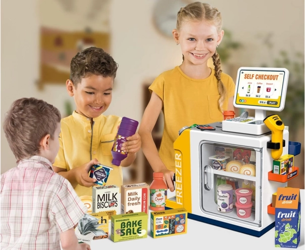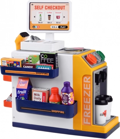 Cette caisse libre-service réaliste avec coin café transforme la chambre en mini-supermarché. Les enfants s’essaient au service des clients, à la préparation du café, au scan des articles et au paiement par carte ou en « espèces ». Un congélateur/réfrigérateur intégré pour desserts et boissons, des boutons colorés et un écran créent une expérience authentique.