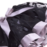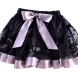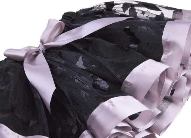 Jupe noire en tulle avec motifs décoratifs, bordure violette et nœud. La taille élastique assure confort et habillage facile.