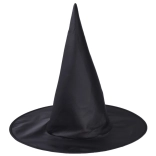 Chapeau de sorcière noir traditionnel avec pointe haute et large bord pour compléter un costume authentique.