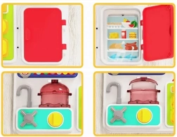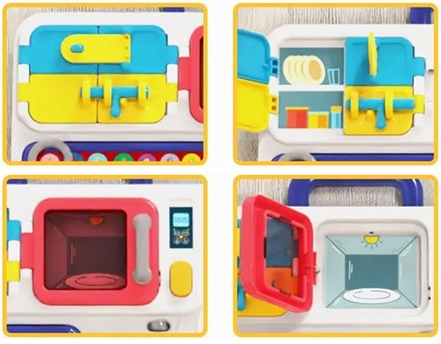 Le set comprend un micro-ondes, une cuisinière et d'autres éléments de cuisine avec des fonctions qui simulent les vrais sons et effets de cuisine.