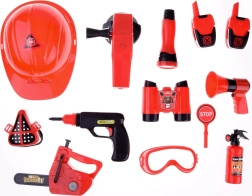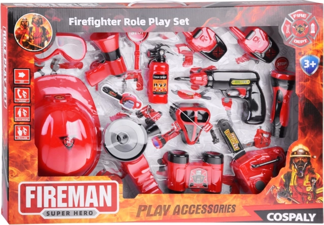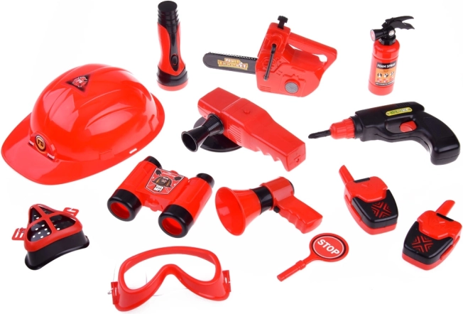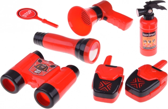 Le set comprend tout le nécessaire pour jouer aux pompiers : casque, jumelles, mégaphone, masque, et autres accessoires de sécurité.