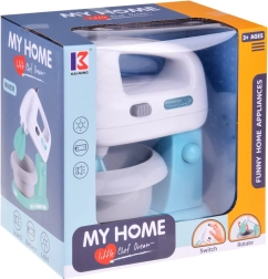 Le jouet imite un véritable mixeur de cuisine avec des fouets rotatifs et un effet lumineux bleu.