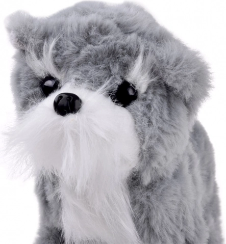 Ses yeux clairs et brillants, sa truffe réaliste et sa peluche grise soyeuse font de ce chiot un compagnon idéal, à la fois pour jouer et comme élément décoratif.