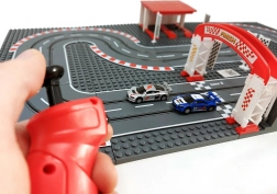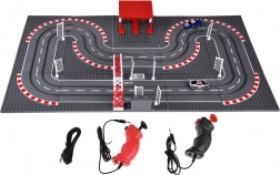 La base modulaire avec 15 plaques et des éléments pour START/ARRIVÉE et parking vous permet de créer vos propres constructions en briques autour de la piste et de modifier le circuit à volonté.