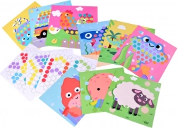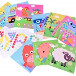 Le set comprend 10 modèles illustrés et 5 gabarits de motifs. Les enfants peuvent assembler des animaux et des moyens de transport, ou créer leurs propres mosaïques.