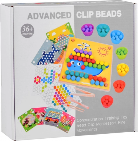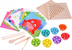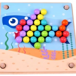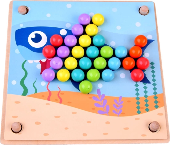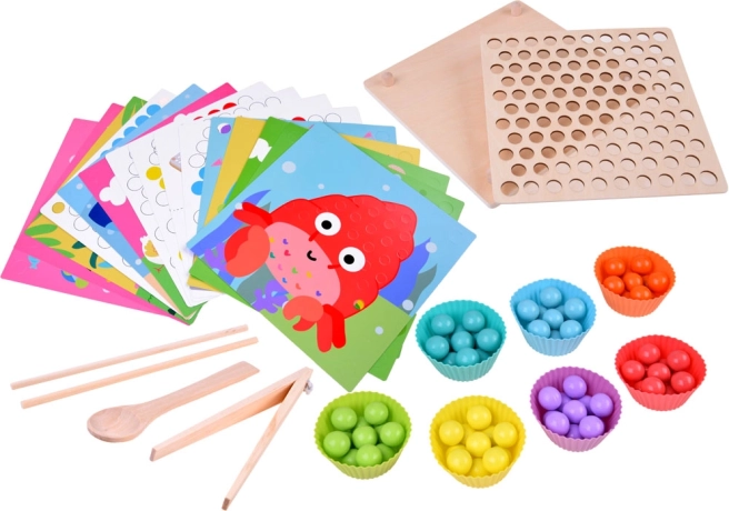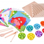 Cette mosaïque en bois comprend 77 billes colorées en 7 couleurs, une planche en bois en deux parties et un riche assortiment d’accessoires, dont des coupelles en silicone, une pince, des baguettes et une cuillère. Les enfants peuvent composer des motifs à partir de 10 gabarits thématiques (p. ex. crabe, pieuvre, requin, raie, baleine, coq, mouton, vache, dinosaure, autobus) et 5 gabarits de motifs – ou créer selon leur imagination.