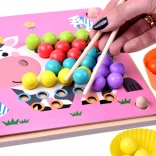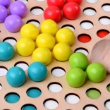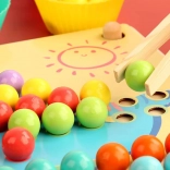 Les enfants manipulent les billes à l’aide de baguettes, d’une pince et d’une cuillère, renforçant ainsi la coordination œil–main et l’assurance des doigts – une préparation idéale à l’écriture.